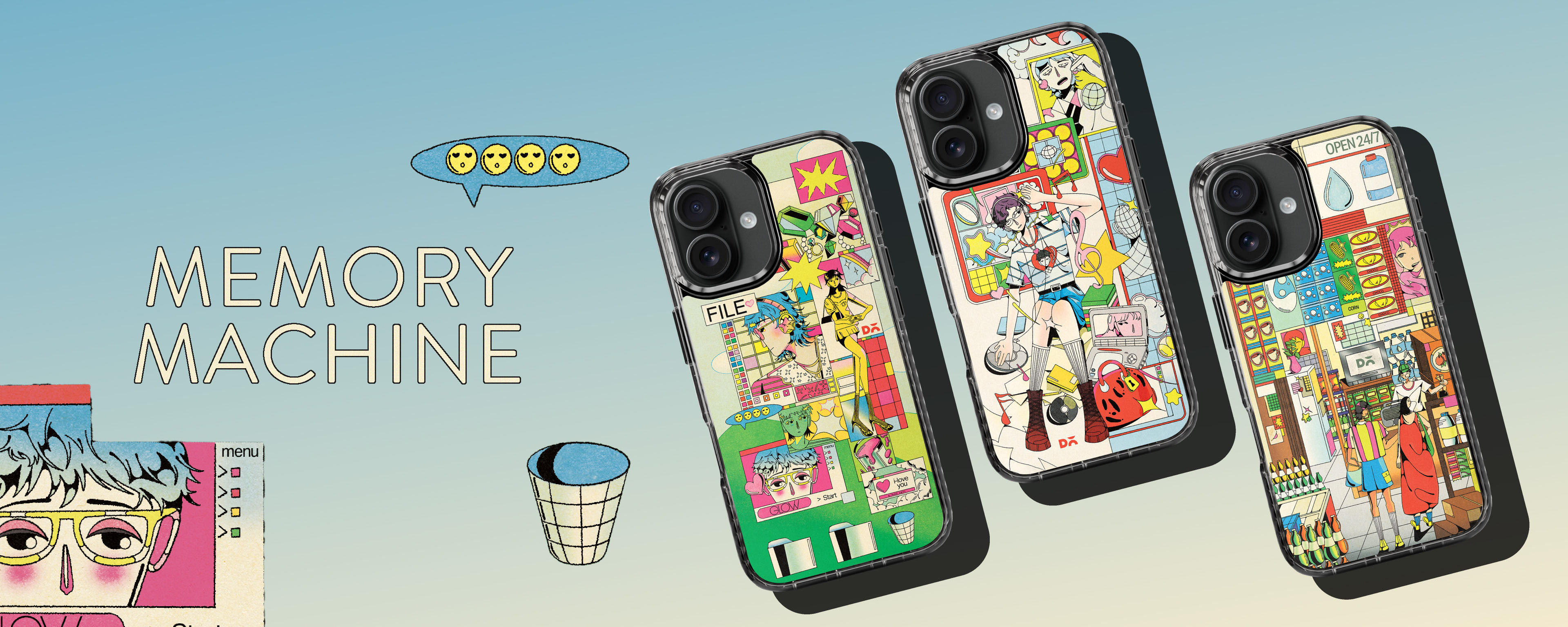 Designed by Filipino artist Miggie Bacungan, Memory Machine is a nostalgic ode to iconic objects and spaces from the early days of internet culture. From vinyls to Walkmans, analog camera films to early web—Bacungan transforms his personal experiences into vibrant visual montages that shaped a generation. This collection invites you to hold on to the little things—and make memories with the people who matter.